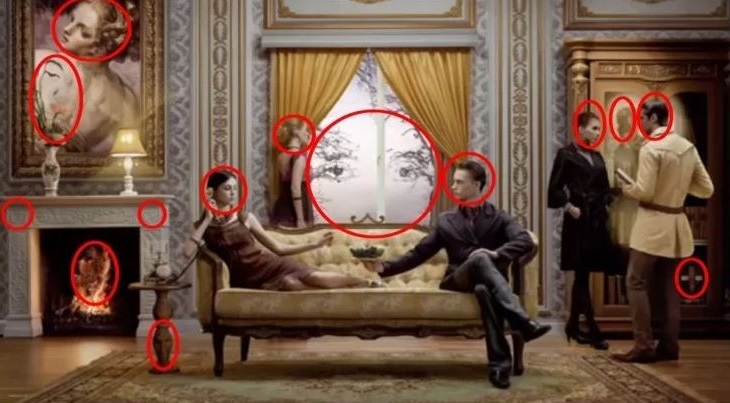 Итак, на картине можно увидеть не менее десяти лиц? Но некоторые люди ухитряются насчитать еще больше! Как насчет 14? А вы сумели разглядеть лица над вазой, на камине, в шкафу, на ножке стола?
