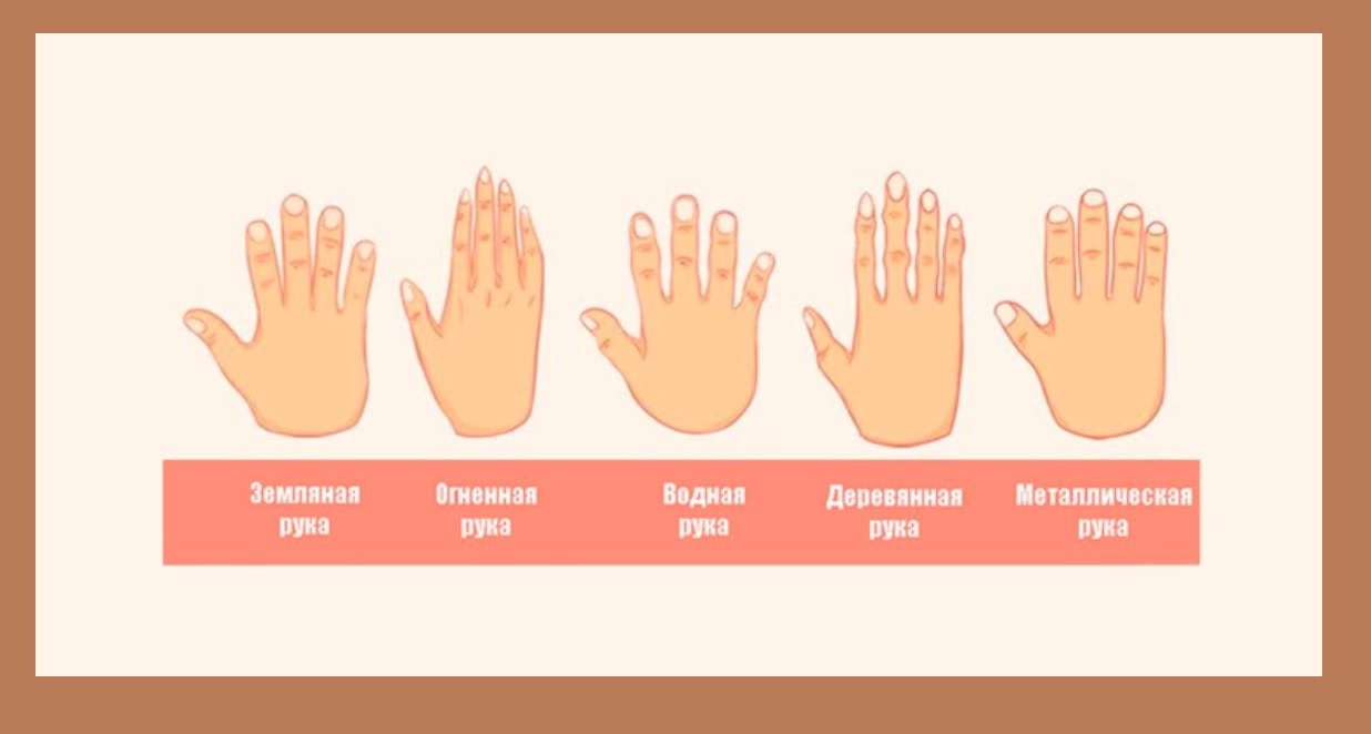 Китайские хироманты выделяют пять типов рук, которые соответствуют земным элементам: воде, огню, дереву, металлу и земле.