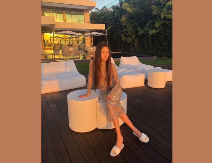 Первого января Вонг выложила фото в Instagram, где была в сияющем белом купальнике, стильных очках и модных пушистых ботах показывала красивые ноги у бассейна.