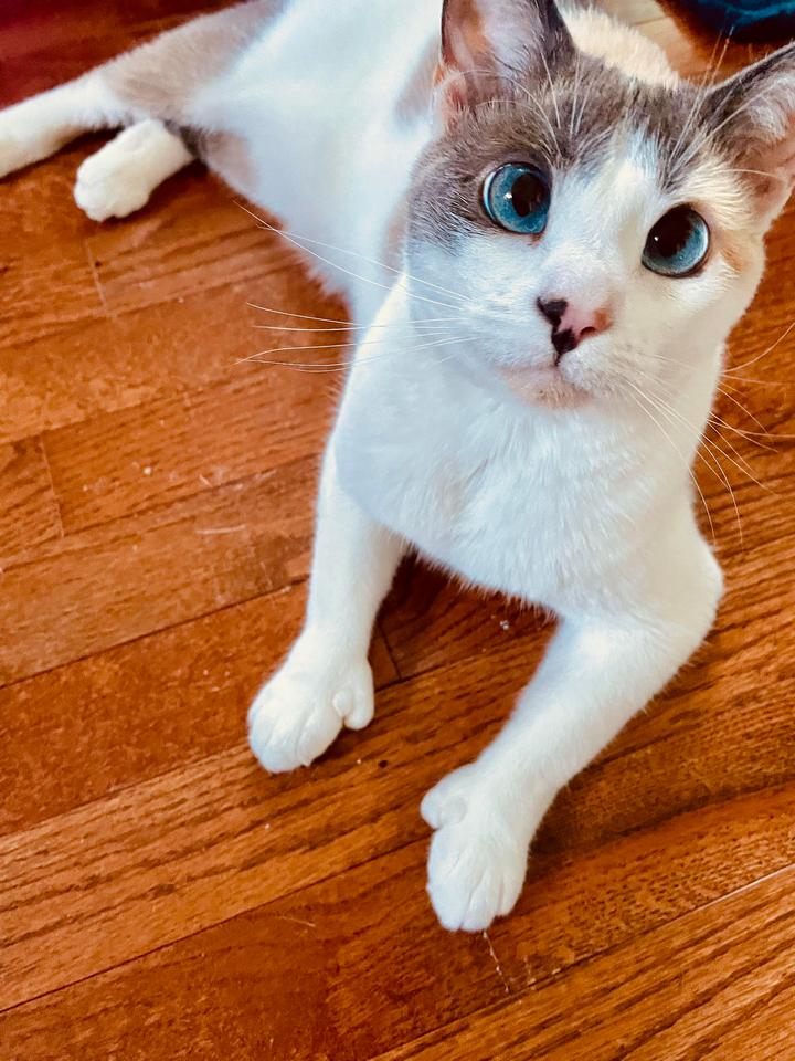 2. “У моей кошки невероятно красивые глаза. Причем один голубой, а другой зеленый.”