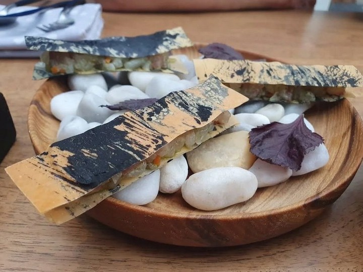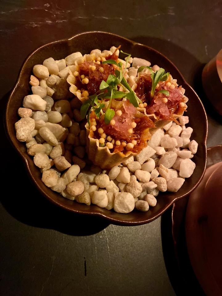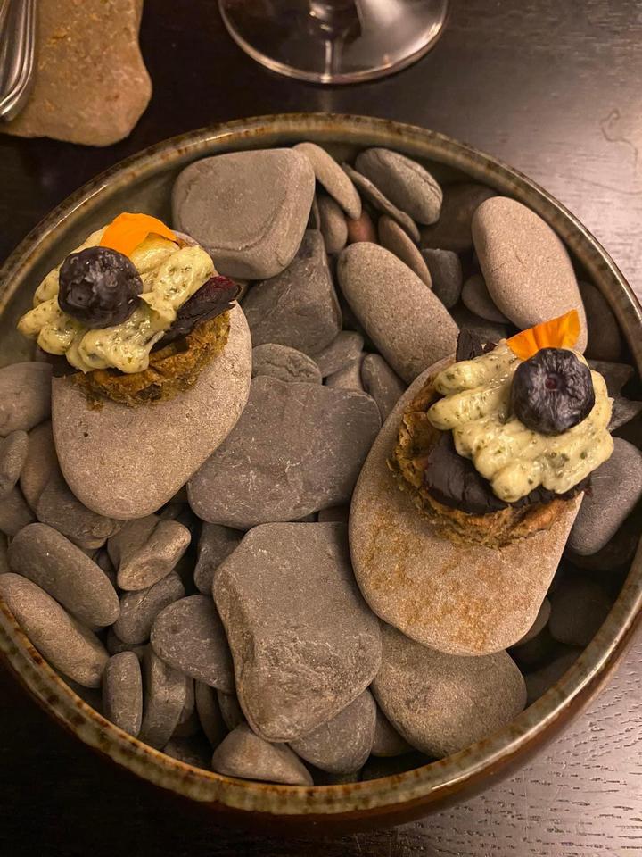 16. Копченый тюлень на вафлях из морских водорослей с беарнским соусом и маринованной черникой. Галька с любимого пляжа того самого тюленя.
