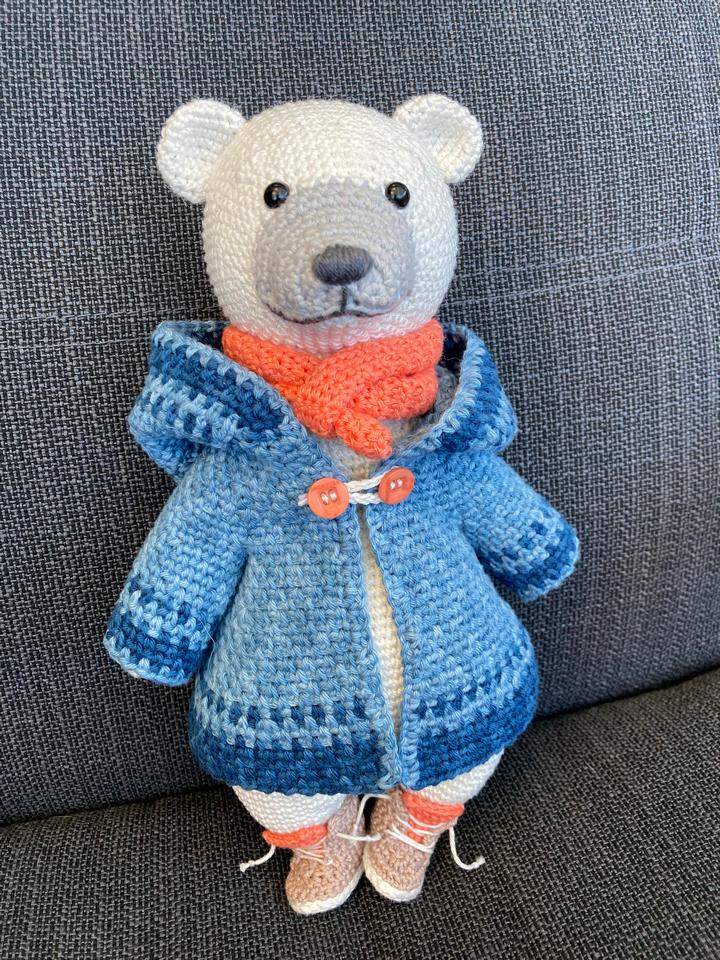 11. “Белый медвежонок в шарфе и пальто, которого я связала своей сестре в качестве подарка на ее 30-летие”