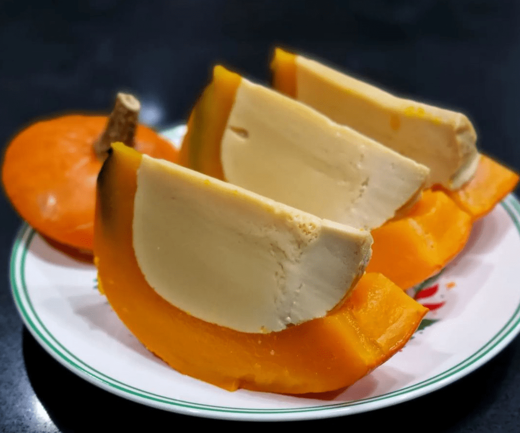 Необычный вид пирога. Чтобы его приготовить, необходимо залить смесь яиц, молока и сгущенки внутрь тыквы и запечь её до готовности.