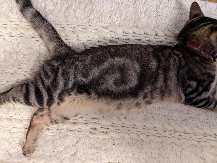 6. “На бочку у моей кошки изображена спираль. Это довольно редкий узор, который нечасто увидишь на шерсти у животных.”