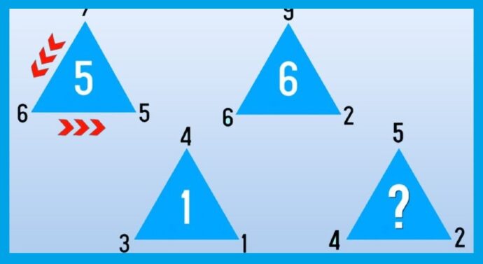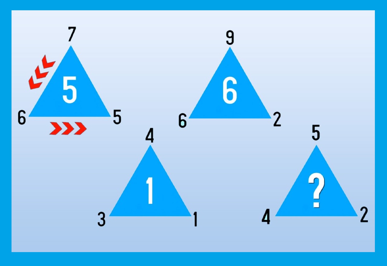 В последнем треугольнике должно быть число 2. Если из числа над треугольником вычесть число слева от него, а потом умножить на число справа, то выйдет: (5 — 4) * 2 = 2. Все эти же действия повторяются во всех треугольниках.