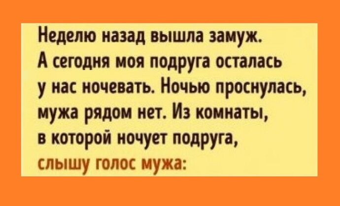 “Неделю назад вышла замуж. А сегодня моя подруга осталась у нас дома переночевать. Проснулась ночью от голосов. Мужа рядом нет, слышу из соседней комнаты, где подруга ночует, голос мужа: «Да она ничего не услышит! Да давай, чего ты!» Взлетела, ворвалась туда разъяренной фурией, уже готовая убивать… А они там сидят в шахматы рубятся. Серьезно, в шахматы! Подруга как раз проиграла, и муж ее уговаривал выполнить обязанность проигравшего и прокукарекать”.
