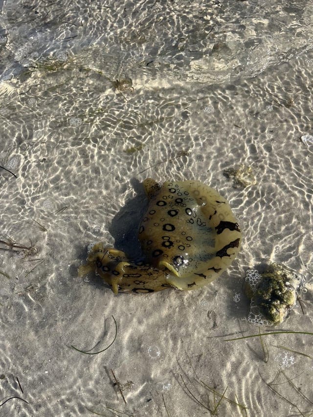 Похоже на пятнистого морского зайца, разновидность морского слизняка. Безвредны для людей, но могут выделять чернила в качестве защиты.