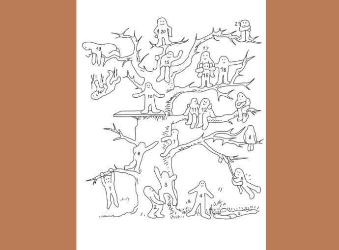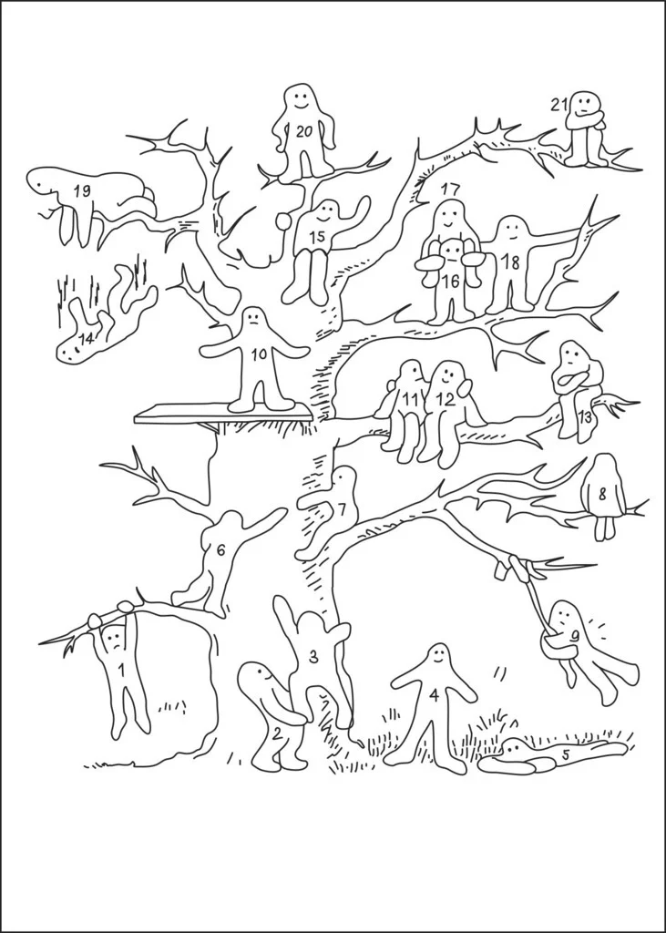 Внимательно рассмотрите изображение. Рассмотрите это дерево. Вы видите на нем и рядом с ним множество человечков. У каждого из них разное настроение, и они занимают различное положение. Выберите того человечка, который напоминает вам себя, похож на вас, ваше настроение.
