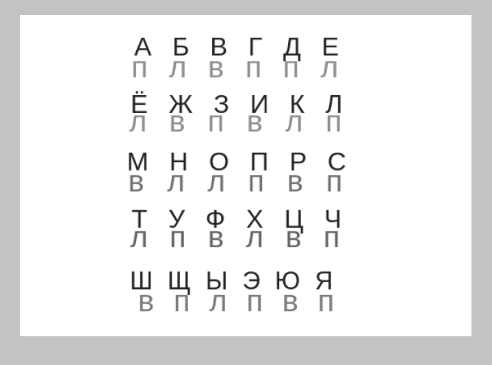 Упражнение на внимание, мышление, реакцию. Под каждой буквой алфавита стоят буквы «Л», «П», «В».