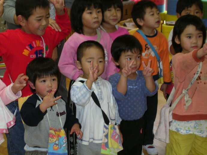 Для матери необычно отправлять своего ребенка в школу до трехлетнего возраста. До этого возраста матери часто берут с собой детей повсюду. Этот физический контакт, который часто наблюдается в сообществах предков, создает более глубокие связи. Близость кожи, но и души. Для японской матери очень важно разговаривать со своими детьми. То же самое касается отцов и дедов. Обычно семьи собираются вместе, чтобы поговорить. Совместная еда и обмен анекдотами — одно из самых частых занятий. Семейные истории рассказываются каждый раз, таким образом создается чувство идентичности и сопричастности даже у самых маленьких. Они также учатся ценить слова и компанию.