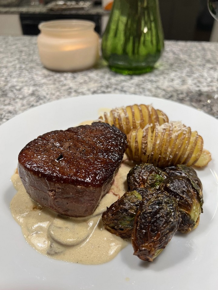 11. Филе-миньон под сливочным соусом с грибами, бренди, пармезаном и со слегка обжаренной брюссельской капустой. Несмотря на то, что блюдо домашнее, выглядит оно очень изысканно.
