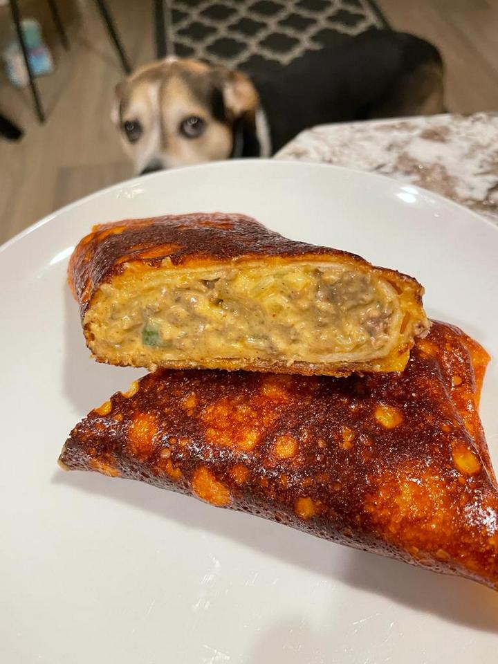 3. “Моя собака тоже не против попробовать это аппетитное сырно-мясное бурито, завернутое в сыр и обжаренное до хрустящей корочки”