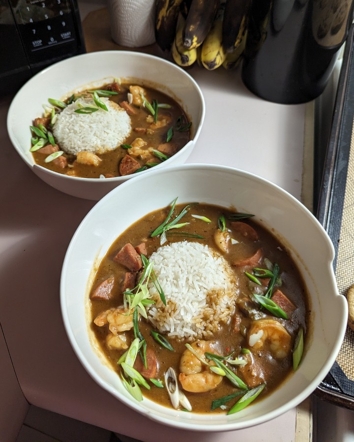 6. “Для приготовления традиционного американского супа гамбо я использовала креветки и колбаски”