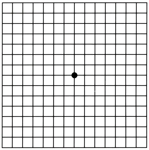 Макулодистрофия — это болезнь, нарушающая центральное зрение человека из-за патологии кровеносных сосудов в центральной зоне сетчатки. Макулодистрофию определяют, проверяя центральное зрение глаза с помощью таблицы Амслера (вверху).
