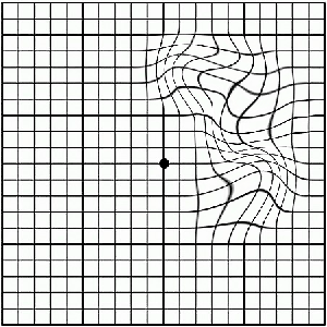 Если у вас всё в порядке с глазами, решётка выглядит ровной. При патологии сетчатки человек видит решётку Амслера примерно так, как показано на рисунке ниже: