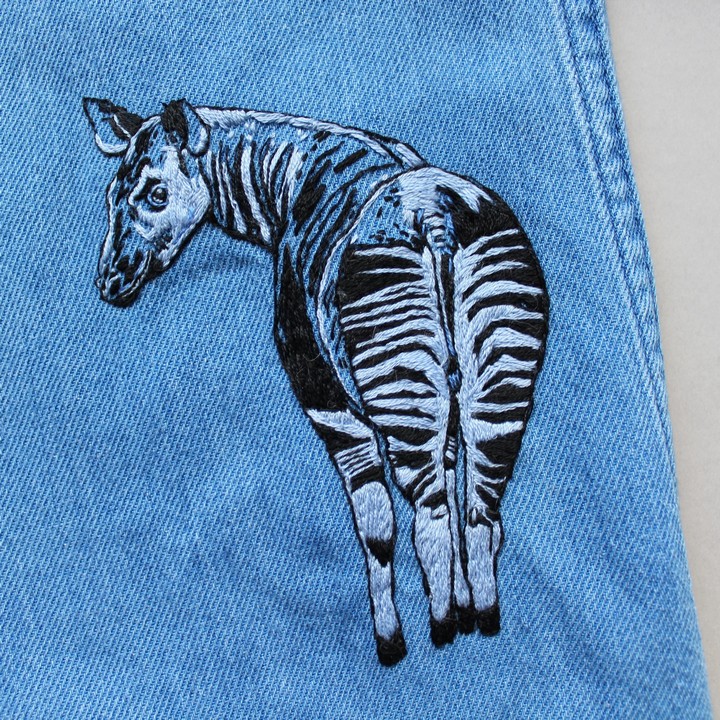 13. “В 2023 году я придумала для себя интересный челлендж: каждую неделю на одном и том же предмете гардероба я вышиваю новое дикое животное. Пришла очередь зебры.”