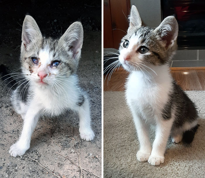 «1 год назад я нашел этого крошечного котенка посреди парковки на моей работе. А это фотографии Зены в стиле „до и после“»