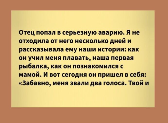 На днях мне позвонили из больницы: «Ваш отец попал в серьезную аварию, его состояние очень тяжелое». Я сорвалась, приехала к нему. Не отходила от него несколько дней, несмотря на все попытки врачей отправить меня домой. Я рассказывала ему наши истории: как он учил меня плавать, наша первая рыбалка, наши походы в кино, как он познакомился с мамой. Сколько я плакала, когда рассказывала все это! И вот сегодня он пришел в себя: «Забавно, меня звали два голоса. Твой и мамин. И я пошел на твой». Мама умерла несколько лет назад. Видимо, хотела увидеть папу снова. Не сегодня, мама, не сегодня.