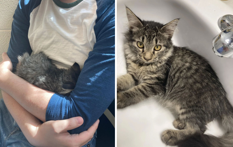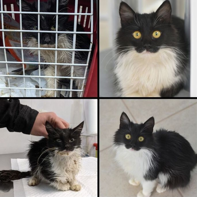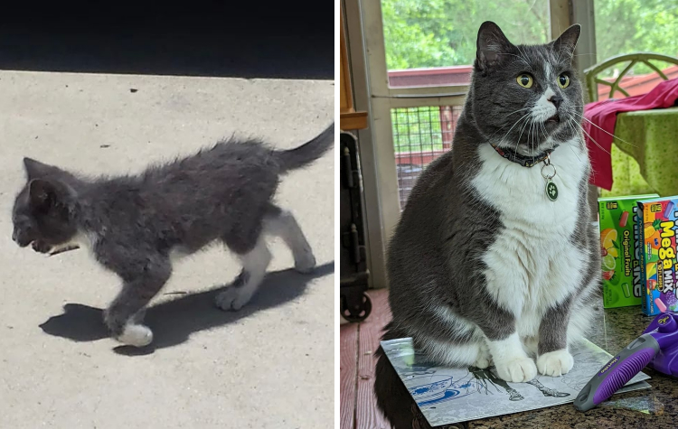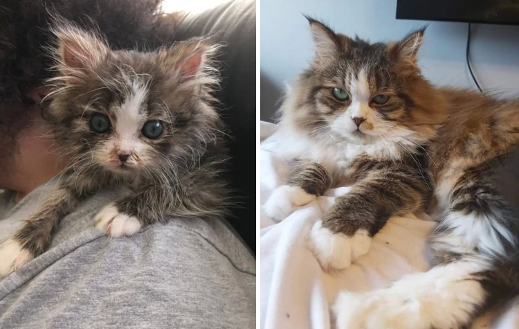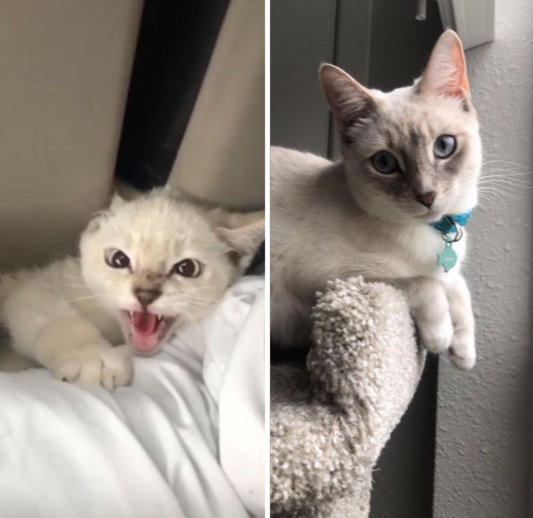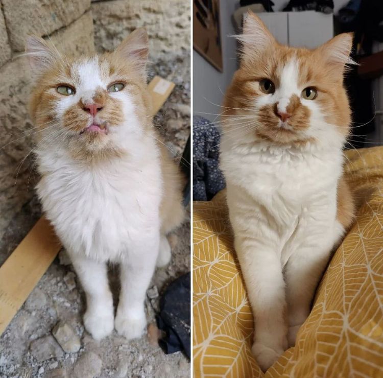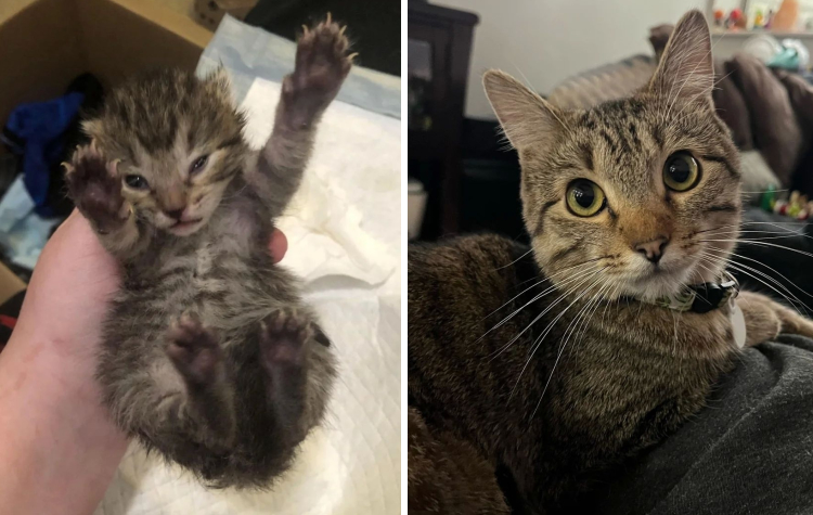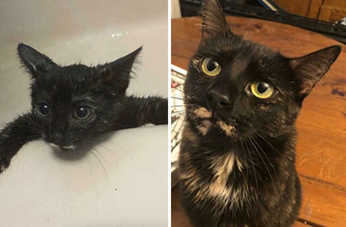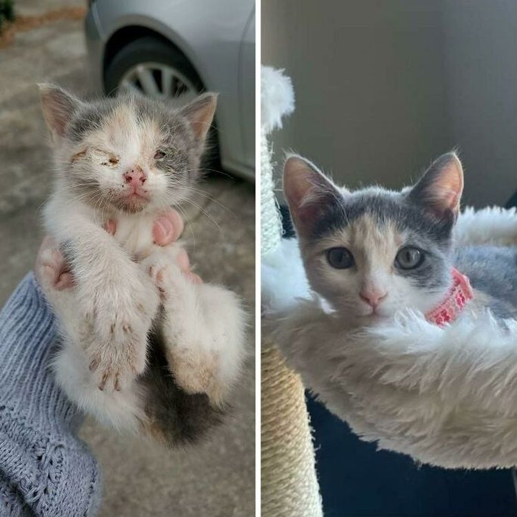 «Я занимаюсь спасением животных. Так выглядел этот котёнок в тот день, когда я нашла его, и вот он сегодня в своем новом доме!»