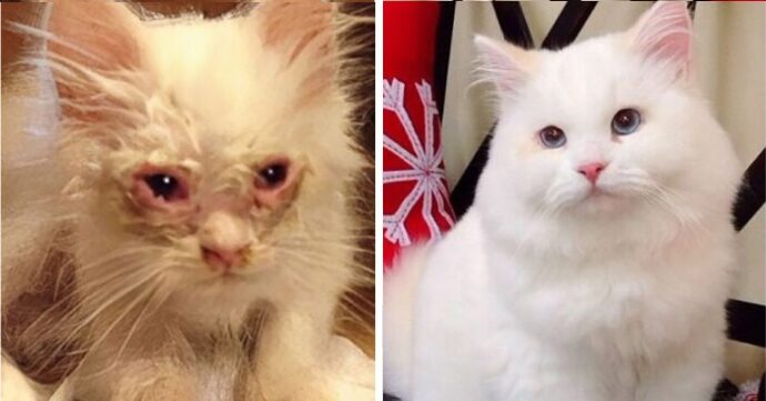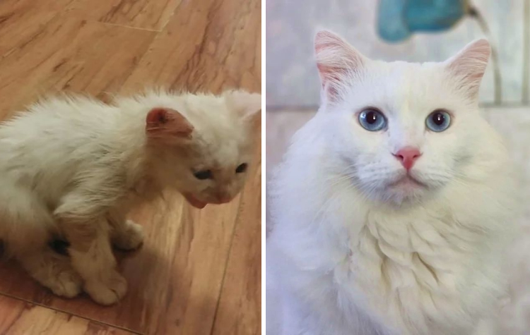 Котенок, найденный на обочине дороги, превратился в пушистого гиганта, который выглядит как белоснежное облачко