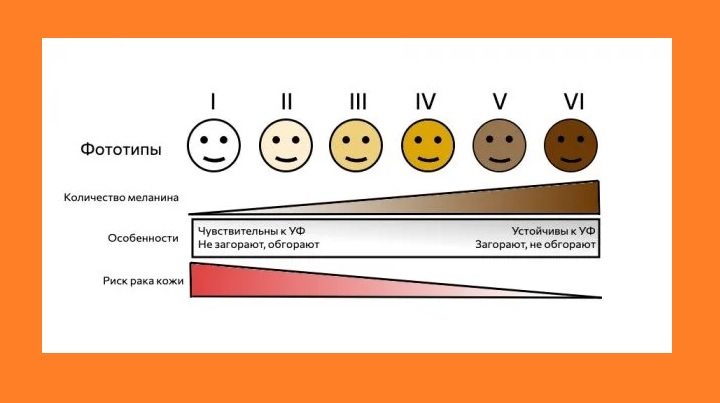 Есть даже специальный инструмент для оценки типов кожи — шкала Фитцпатрика с шестью фототипами.