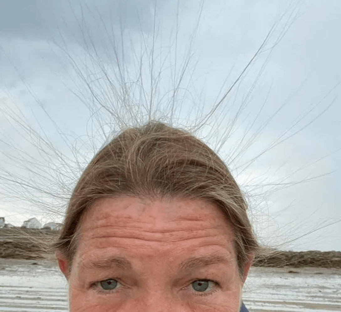 Женщина гуляла со своими собаками на пляже в Джерси, когда почувствовала очень сильное покалывание на голове и заметила, что ее волосы встали дыбом.