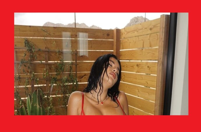 Выглядя пикантно в красном, она осмелилась надеть смелый комплект, состоящий в основном из веревок.
