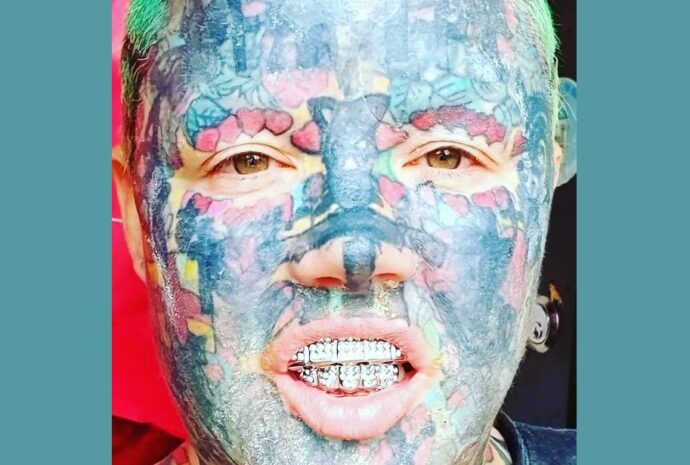 Валлийка, мать двоих детей, чьи младшие дети не знают, как она выглядит с голым лицом, теперь синеет из-за количества рисунков на ее лице. Ей делают татуировки примерно три раза в день.