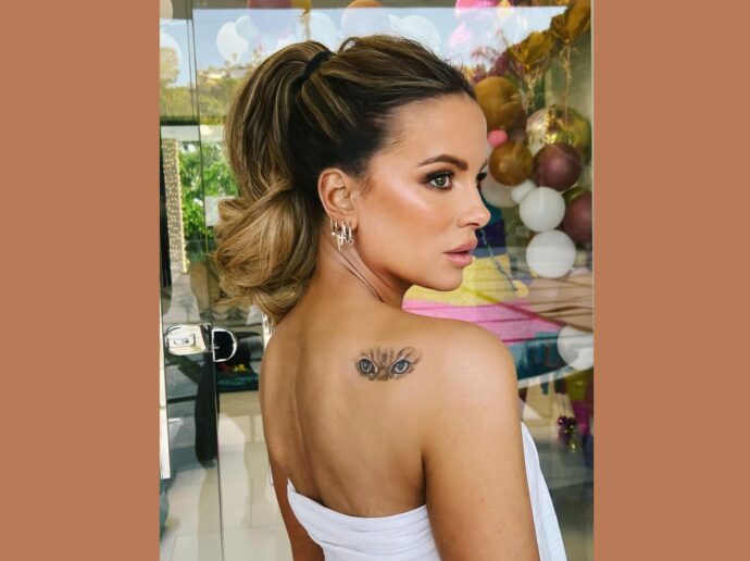 Кремовое боди Кейт отличалось глубоким вырезом, подчеркивающим ее бюст, а короткий образ также подчеркивал ее подтянутые ноги. Она придерживалась бежевой цветовой гаммы и надела широкополую шляпу.