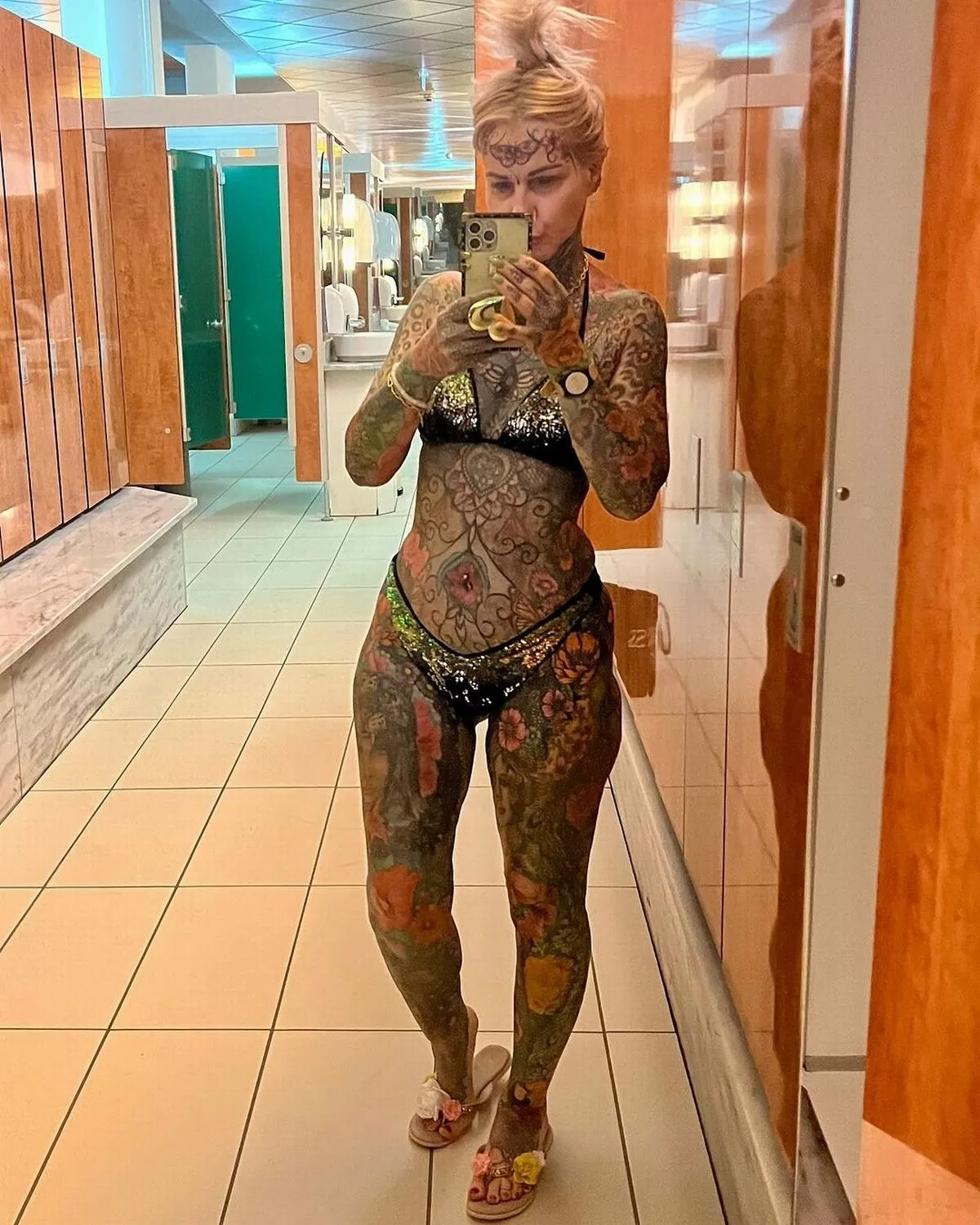 Ее замысловатые дизайны представлены во всей красе – от леопардового принта на руках до цветочных мотивов на бедрах и узоров мандалы на груди.