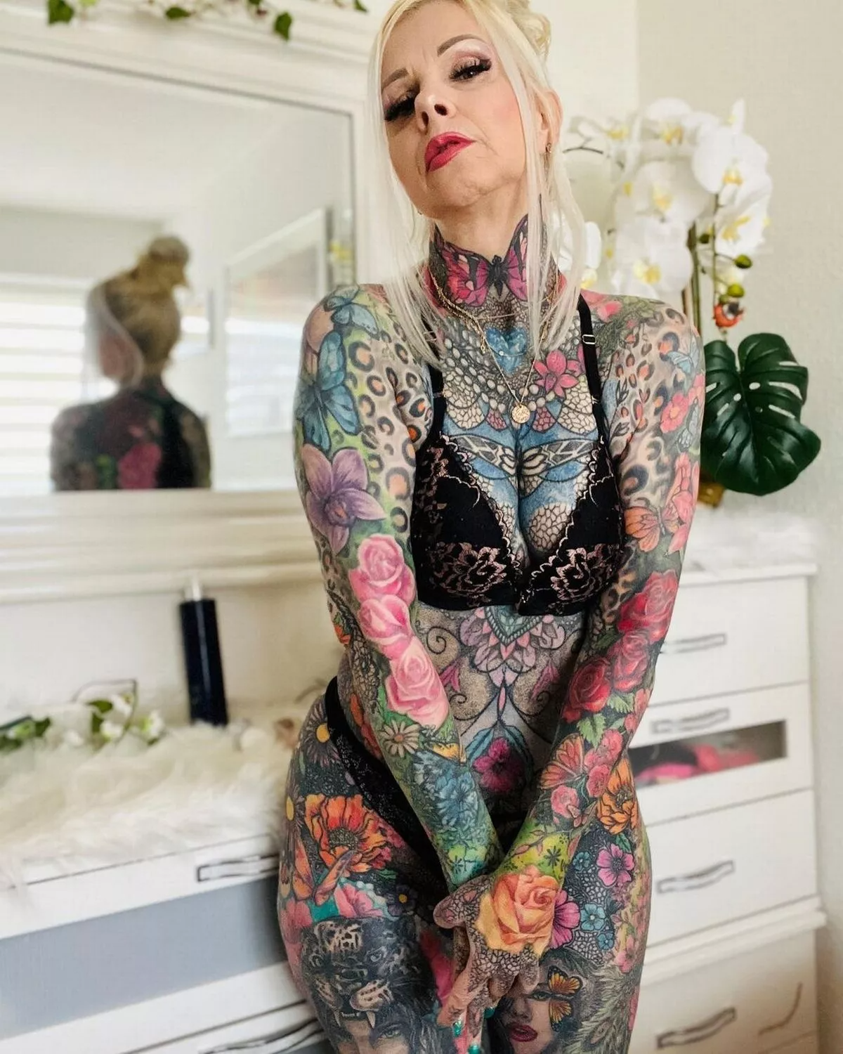 Бабушка относится к своему телу как к живому холсту для татуировок.