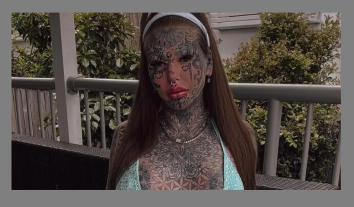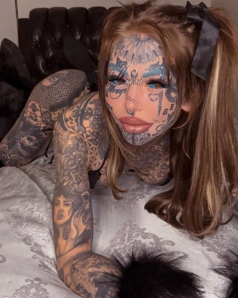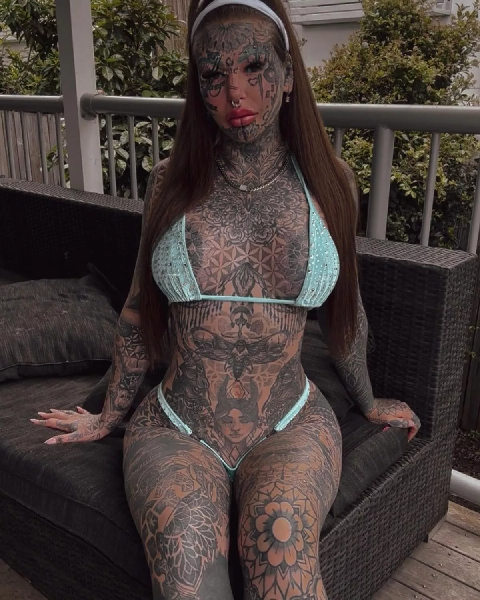 Сейчас у модели более 600 татуировок. У нее также есть модификации тела, такие как разделенный язык и дермалы – пирсинг, помещаемый под кожу.
