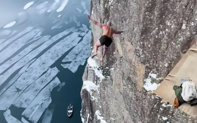 Норвежский дайвер-смертель Кен Сторнес только что стал первым человеком, совершившим «смертельное погружение» с высоты более 40 метров, прыгнув со скалы в ледяную воду внизу.
