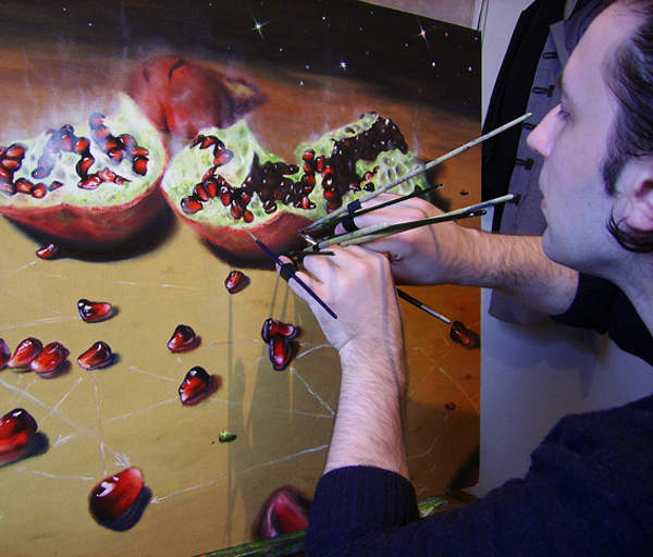 Художник-самоучка сначала отточил свои навыки традиционной техники масляной живописи, а затем экспериментировал с несколькими кистями одновременно и освоил различные стили, от экспрессионизма до гиперреализма .