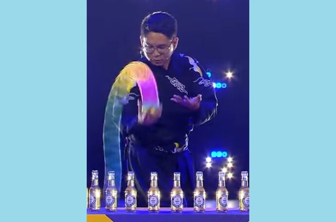 В шоу Ву использовал игрушку-пружину, чтобы окружить 41 бутылку за 1 минуту, возвращая игрушку в руки после каждой бутылки.