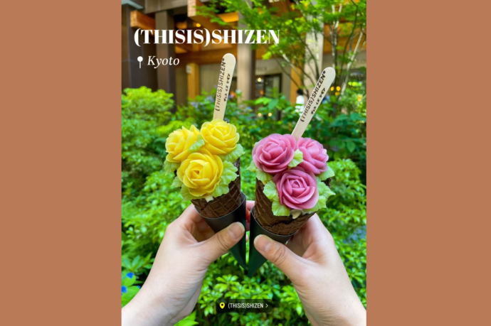 (THISIS)SHIZEN — кафе в Киото, которое приобрело популярность благодаря своим художественным рожкам мороженого, напоминающим замысловатые цветочные букеты.