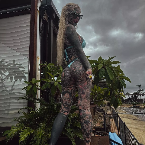 Недавно она показала людям, насколько татуировано ее тело, когда вышла в сад в одном только крошечном синем бикини. Эмбер мало что оставила воображению и рассказала, что даже ее ягодицы покрыты татуировками.