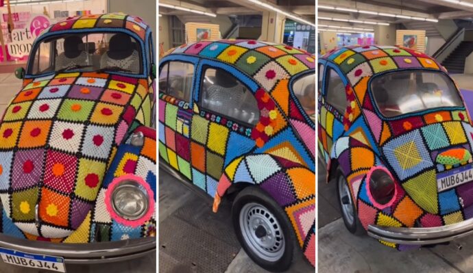 Бабушка шестерых детей потратила полгода на работу над узором, который покрывает весь ее автомобиль VW Beetle. Она использовала разную шерсть, чтобы создать множество узоров разного цвета.