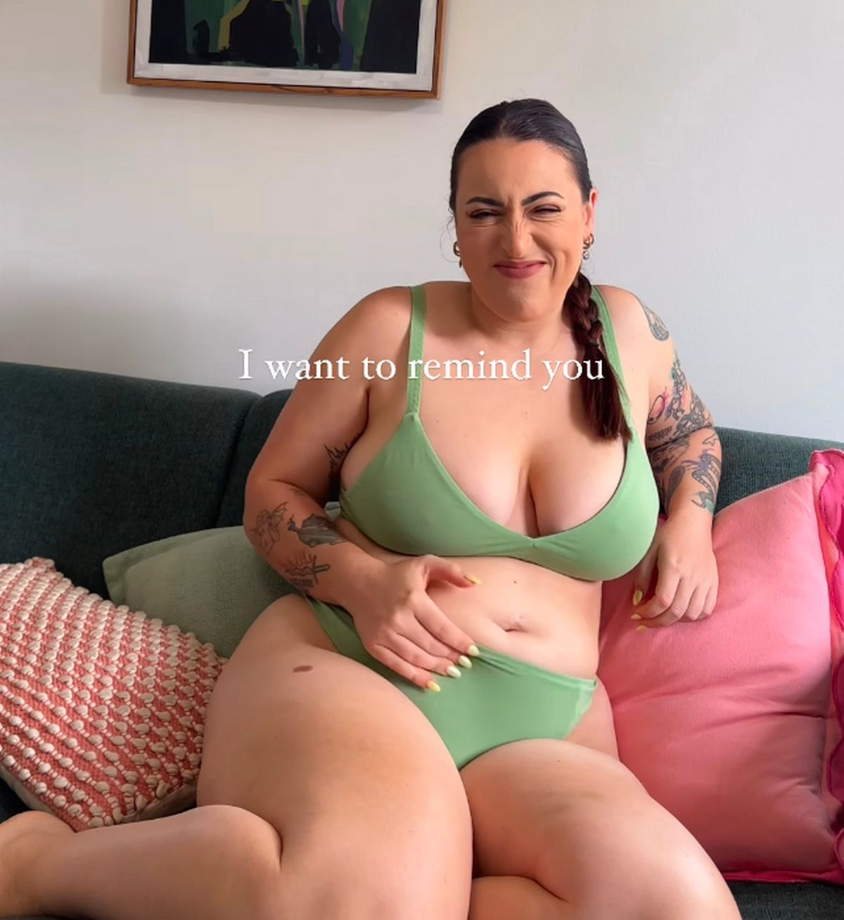 Белла поделилась видео, подтверждающим свою точку зрения, где она смотрела на своем телефоне рекламу диеты и похудания в зеленом бикини. Она написала поверх этого: «В мире, полном этого… Я хочу напомнить вам, чтобы вы не чувствовали давления, заставляющего менять свое тело только потому, что это делают другие люди».