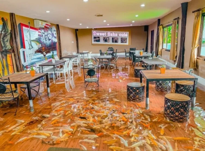 Помните Amix Coffee, «затопленное кафе» Хошимина, где сотни декоративных рыб всех форм и размеров жили на покрытом водой полу, пока посетители ходили между ними? Оно вызвало много критики со стороны защитников прав животных и закрылось всего через пару месяцев, но если вам понравилась концепция, вы будете рады узнать, что есть еще одно затопленное кафе, которое вы можете посетить. Sweet Fishs Café — уникальное заведение в тайском городе Кханом, где люди могут прогуляться по воде по щиколотку, наполненной десятками рыб кои.