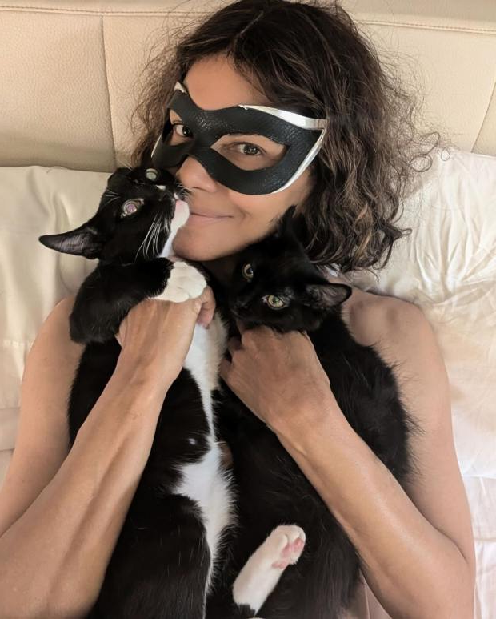 На другом снимке Хэлли лежит в постели, один черный котенок отдыхает у ее лица, а другой лежит у нее на груди.