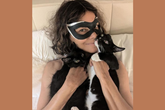 На первой фотографии в серии Хэлли держит на руках крошечного черно-белого кота, корча ему рожицу с поцелуем, в то время как другой покоится у нее на руках, прикрывая грудь.