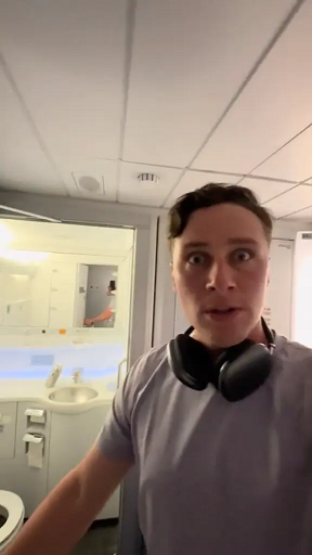 «Как это круто?» — восклицает создатель контента, распахивая одну из дверей, чтобы показать туалет, который, несмотря на свое необычное расположение, имеет довольно стандартные размеры для самолета.