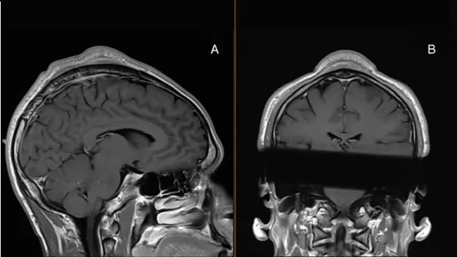 После осмотра болезненной выпуклости и проведения структурного сканирования черепа пациента врачи определили, что между кожей и черепом находится мягкая масса, но также и то, что кожа над массой и кость под ней были значительно толще окружающих их тканей. Они решили хирургическим путем удалить массу, а также сбрить скальп мужчины до уровня окружающих тканей.