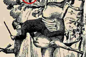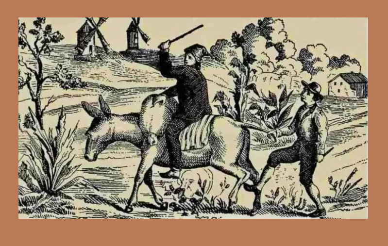 На иллюстрации изображена деревенская сцена, где можно увидеть мужчину верхом на осле. Другой человек тянет осла за хвост. Помимо двух мужчин на этой фотографии есть еще и женщина. Она спрятана где-то на изображении. Ваша задача — найти спрятавшуюся женщину за 10 секунд.