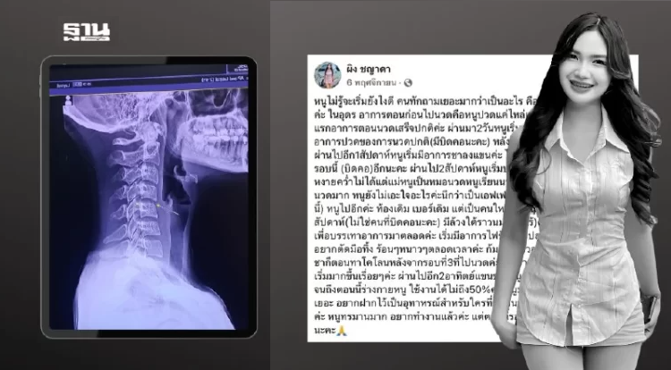 «Я не знаю, с чего начать. Многие спрашивали меня, что случилось. Я пошла на массаж в одно место в Удонтхани», — написал Пхинг Чьяда в Facebook. «До массажа у меня были такие симптомы, что болели только плечи. Когда я впервые пошла на массаж, мои симптомы были обычными. Через два дня у меня начала болеть задняя часть шеи. Я думал, что это просто обычная боль от массажа».