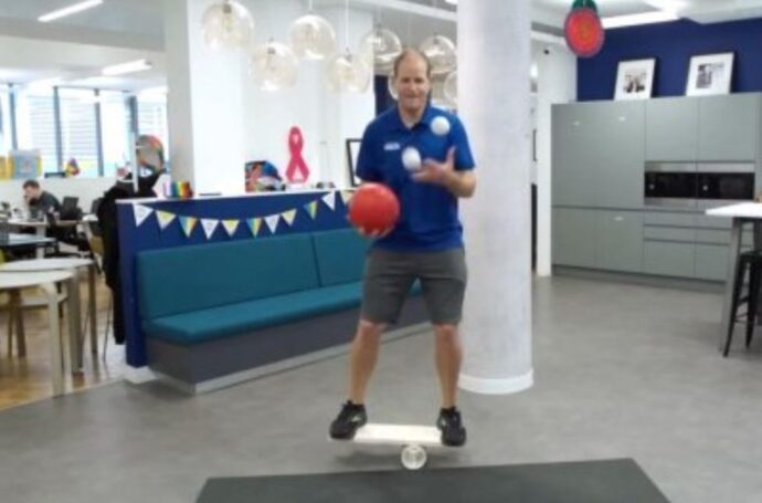 Дэвид Раш, обладатель наибольшего количества титулов, занесенных в Книгу рекордов Гиннесса, подверг свою силу и координацию серьезному испытанию, когда попытался побить рекорд по количеству жонглированных ловлей шара для боулинга и двух шаров на балансировочной доске за одну минуту.