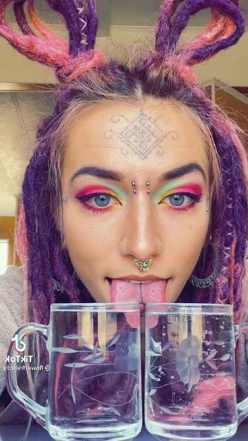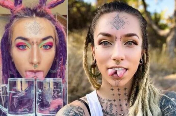 У нее татуировки на лице и руках, проставки для ушей, пирсинг на переносице и раздвоенный язык.