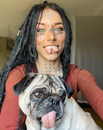 У нее татуировки на лице и руках, проставки для ушей, пирсинг на переносице и раздвоенный язык.
