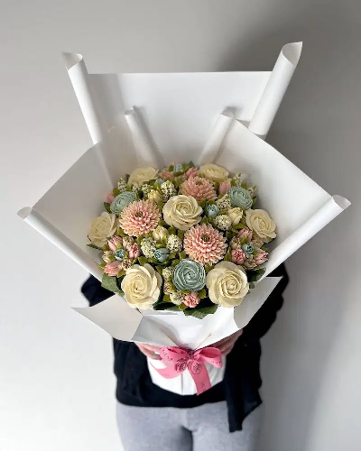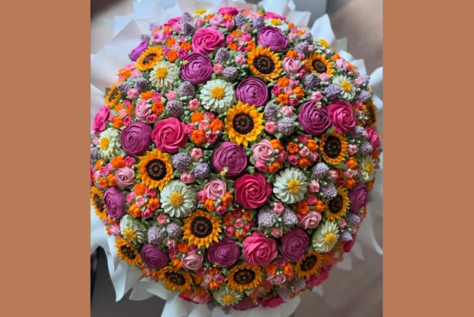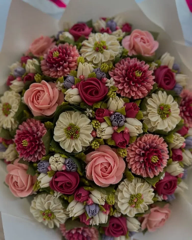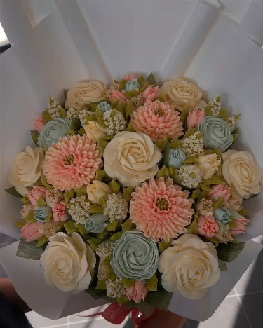 Как только она освоила кучу привлекательных цветочных дизайнов для своей глазури для капкейков, она решила собрать их в великолепные съедобные букеты.